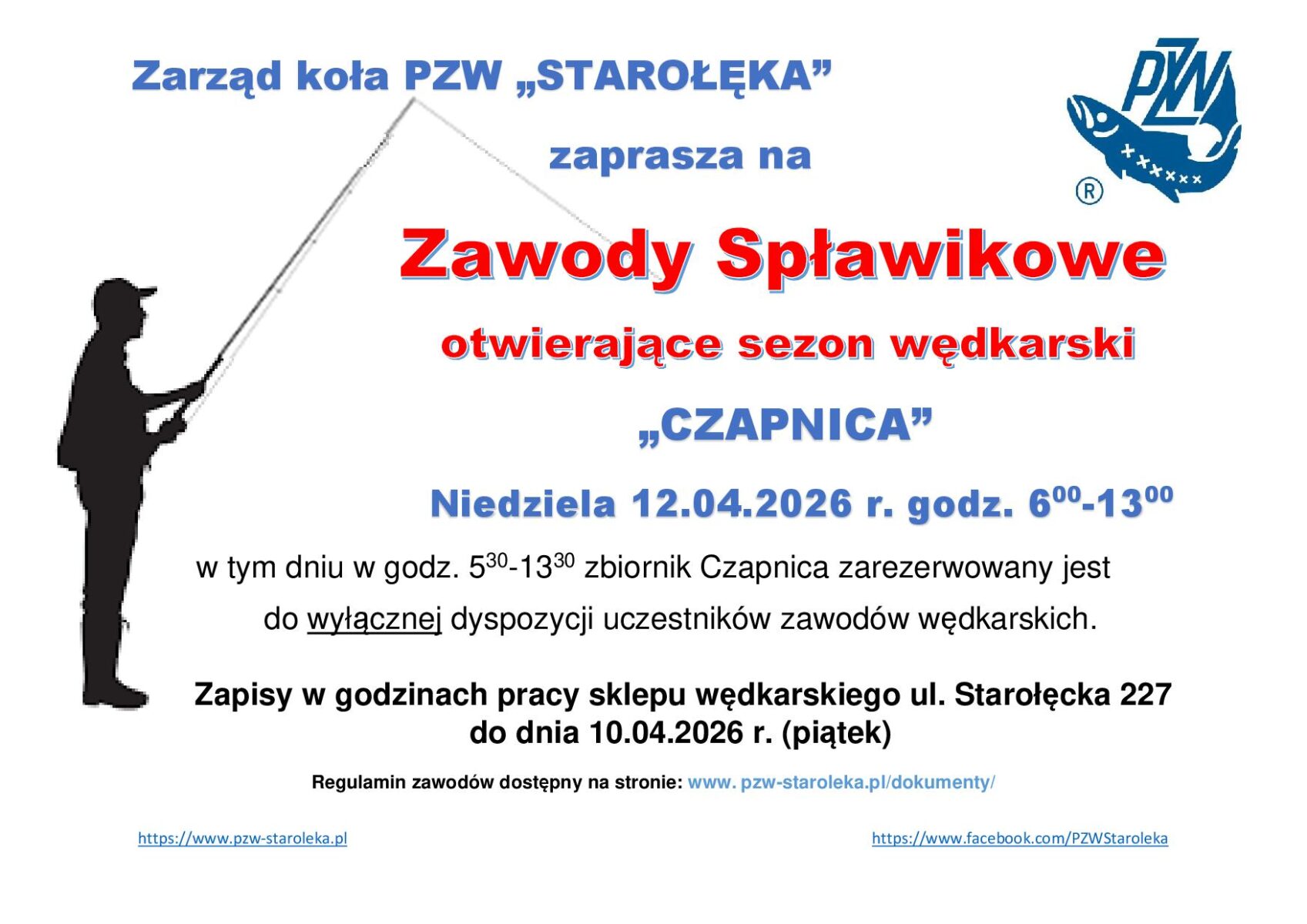 Zapraszamy na pierwsze zawody wędkarskie nad Czapnicą w 2026 r. Zbiórka o godzinie 5.30 – 6.00 przy Rybakówce ul. Bronisława Malinowskiego 45. Przypominamy o zapisach do piątku 10.04.2026 r. w sklepie wędkarskim przy ul. Starołęckiej 227.