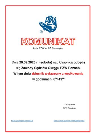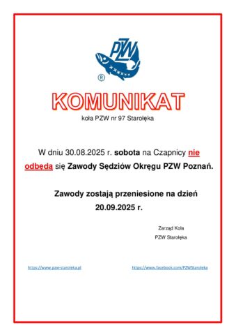 Posted on 19 sierpnia 2025 Komunikaty Zmiana terminu Zawodów Sędziów Okręgu PZW Poznań na 20.09.2025 r.